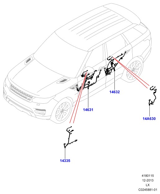 ЭЛЕКТРИЧЕСКАЯ ПРОВОДКА ПРАВАЯ ЗАДНЯЯ ДВЕРЬ; АУДИОСИСТЕМА НИЗКОЙ СЕРИИ - 400 ВТ С ДАТЧ.ВНЕШНЕГО ОСВЕЩЕНИЯ В САЛОНЕ АУДИОСИСТЕМА PREMIUM 1280 ВТ ФОНОВОЕ ОСВЕЩЕНИЕ САЛОНА - PREMIUM | 1 | LR050143 ↳LR050146 | ||||